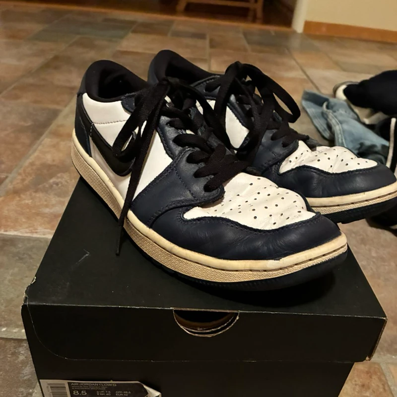 Säljer ett par golfskor vita med blåa.