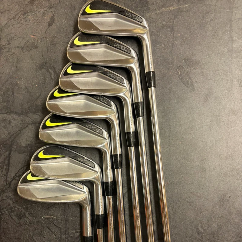 Set of Nike Vapor golf irons, includes 7 clubs. The clubs show clear signs of use with noticeable scratches and some dings, especially visible on the sole of the 8 iron.