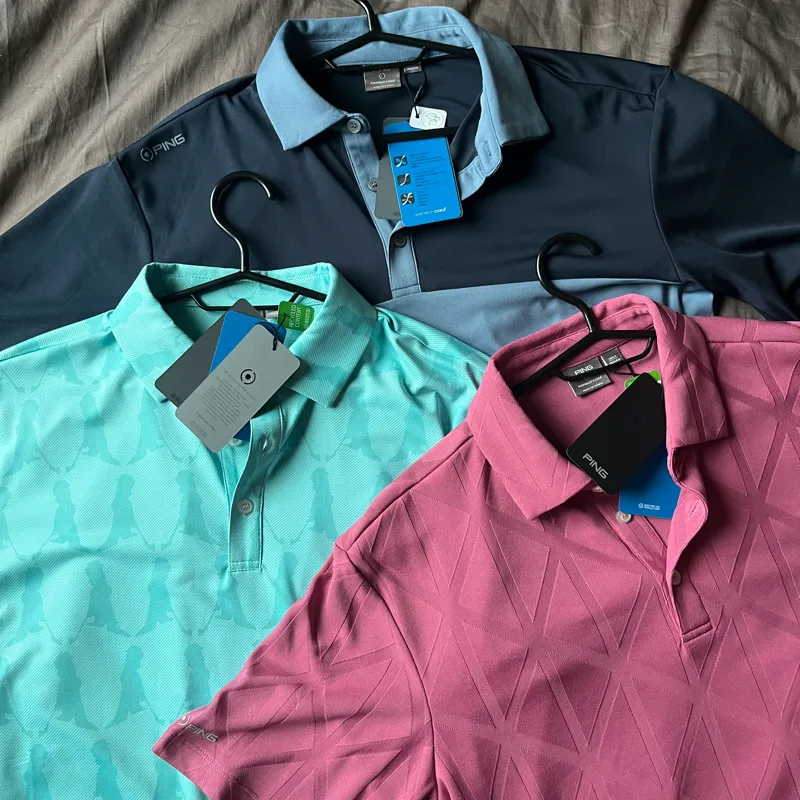 Oanvända pikétröjor från Ping. Storlek M (EU/UK). Etiketter kvar. Modell sensorcool, sköna tröjor som jag har fler av och dessa har blivit hängandes i garderoben.