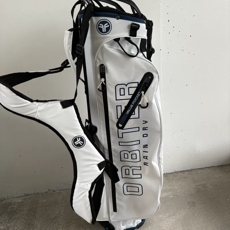 Vit Orbiter golfbag med många praktiska fack för förvaring. Perfekt för golfrundan, oavsett väder. Väskan är designad för att hålla dina värdesaker torra och säkra.