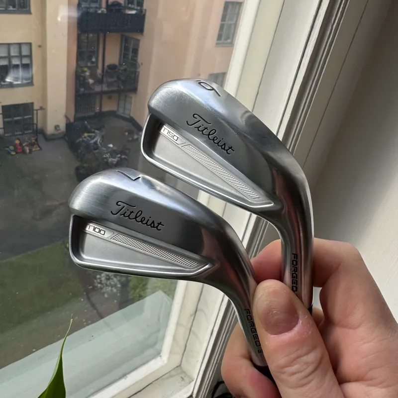 De är 0.25” förlängda, standard lie, T100 (7-Pw) har standard loft men T150 6an har bockats 2 grader svag till T100 6a loft (30*) och T150 5an en grad svag (26*) för kontinuitet mellan modellerna. De är i väldigt bra skick utöver ett litet setskott på hälen av Pw, se bild.
